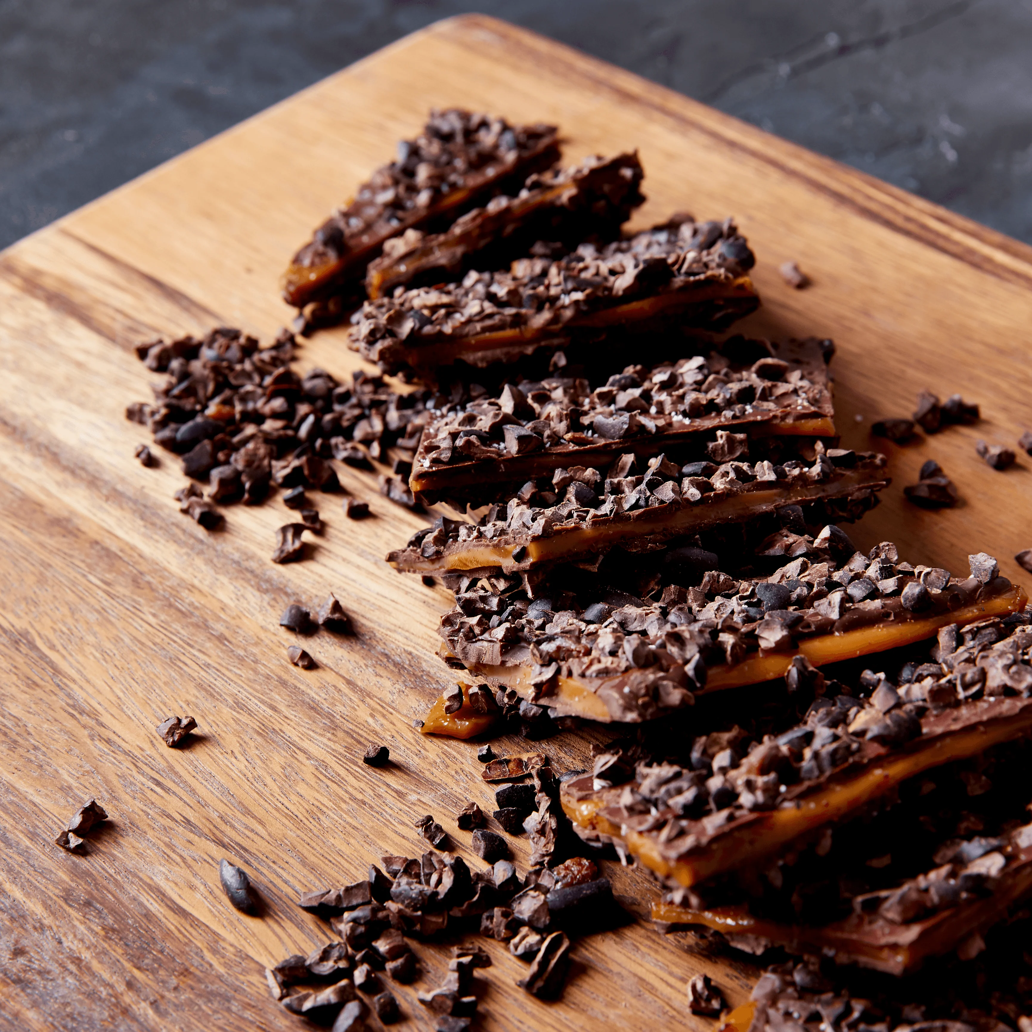 Our Executive Pastry Chef, Lisa Vega, crafted this not-too-sweet traditional toffee for our first Valencia Street café, and it has been a guest favorite ever since. This is a full pound of dark, crunchy butter toffee is covered in our fudgy, 70% Camino Verde, Ecuador chocolate; studded with nutty, toasted single-origin cocoa nibs to balance sweetness; and lightly sprinkled with sea salt for heightened flavor.